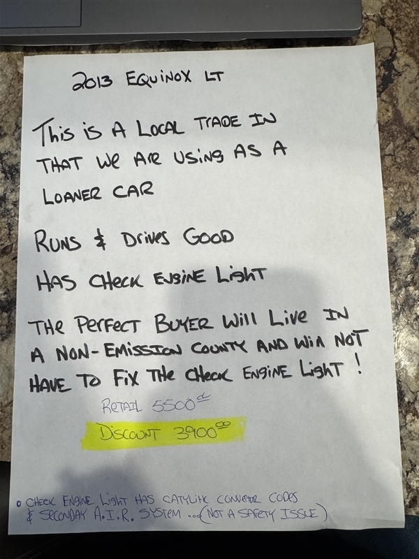 RUNS & DRIVES GOOD...LOCAL TRADE IN THAT WE ARE USING AS A LOANER CAR...HAS A CHECK ENGINE LIGHT ON...